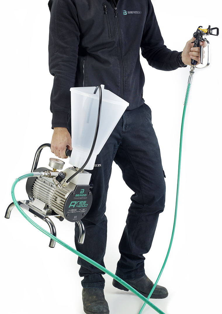 Ares 4200 je visoko zmogljiva električna membranska črpalka, zasnovana za profesionalno Airless brizganje barv v gradbenem in kovinarskem sektorju. Naprava deluje na principu visokotlačnega brezzračnega pršenja (Airless), kar omogoča hiter nanos in minimalno odvečno pršenje (overspray) pri obdelavi srednje velikih do velikih površin. Zaradi svoje praktičnosti in možnosti izbire med vertikalno ali horizontalno postavitvijo motorja predstavlja izjemno prilagodljivo rešitev za vsakega uporabnika.
